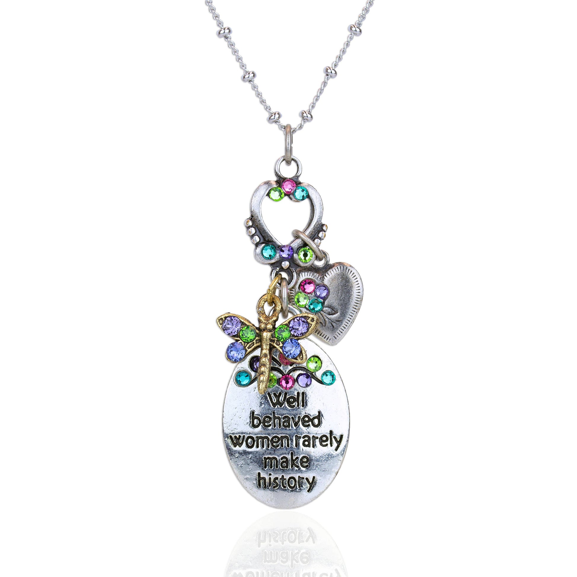 Muestra tu feminidad audaz con este collar de dijes significativo y enredado. Con un medallón que dice "Las mujeres bien portadas rara vez hacen historia", una pequeña libélula y un dije de corazón con brillantes detalles de cristal, todo colgando de un corazón abierto con detalles de cristal, esta pieza encarna la hermosa fuerza de una mujer. Hecho en EE. UU. con latón antiguo sin plomo ni níquel y fundiciones de metal blanco plateado y cadena de bolas. Cierre de pinza de langosta. Colores de cristal: verde azulado, azul violeta, azul, verde brillante, fucsia. Medidas aproximadas: Conjunto 1 9/16" de largo x 5/8" de ancho; Cadena ajustable de 16-18".
