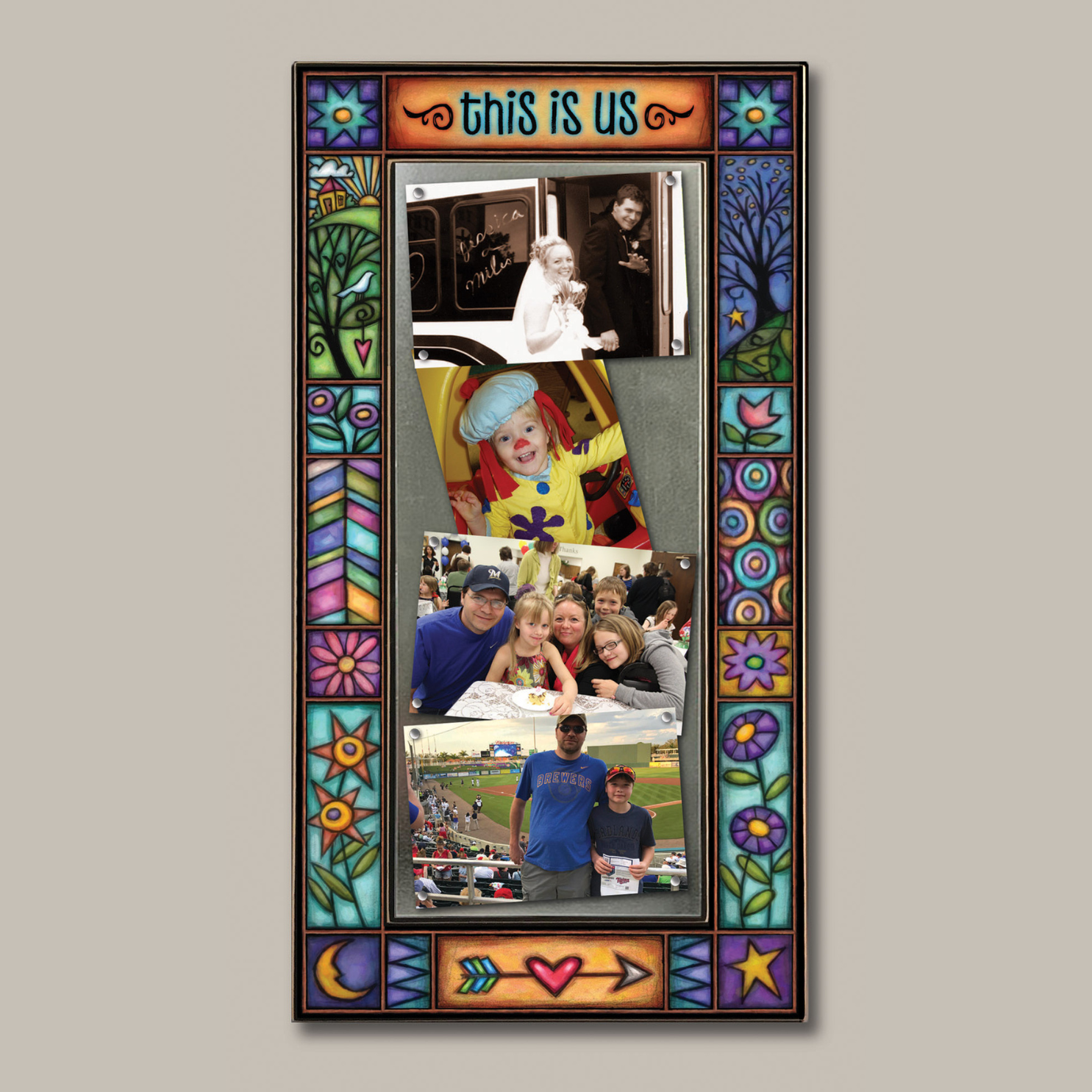 Marco con el arte de Michael Macone y la cita "Estos somos nosotros". Este marco de madera de 28 x 53 cm contiene cuatro fotografías de 10 x 15 cm en un cuadrado de chapa metálica con cuatro imanes de tierras raras ultrapotentes. Está impreso con tinta de archivo sobre papel de archivo adherido a la madera y con recubrimiento UV para una larga duración.