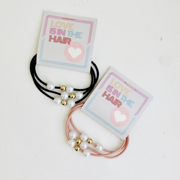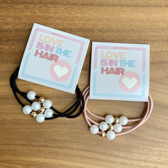 Envía un poco de amor con este práctico regalo. Las gomas para el pelo con perlas son un clásico entre nuestros clientes.