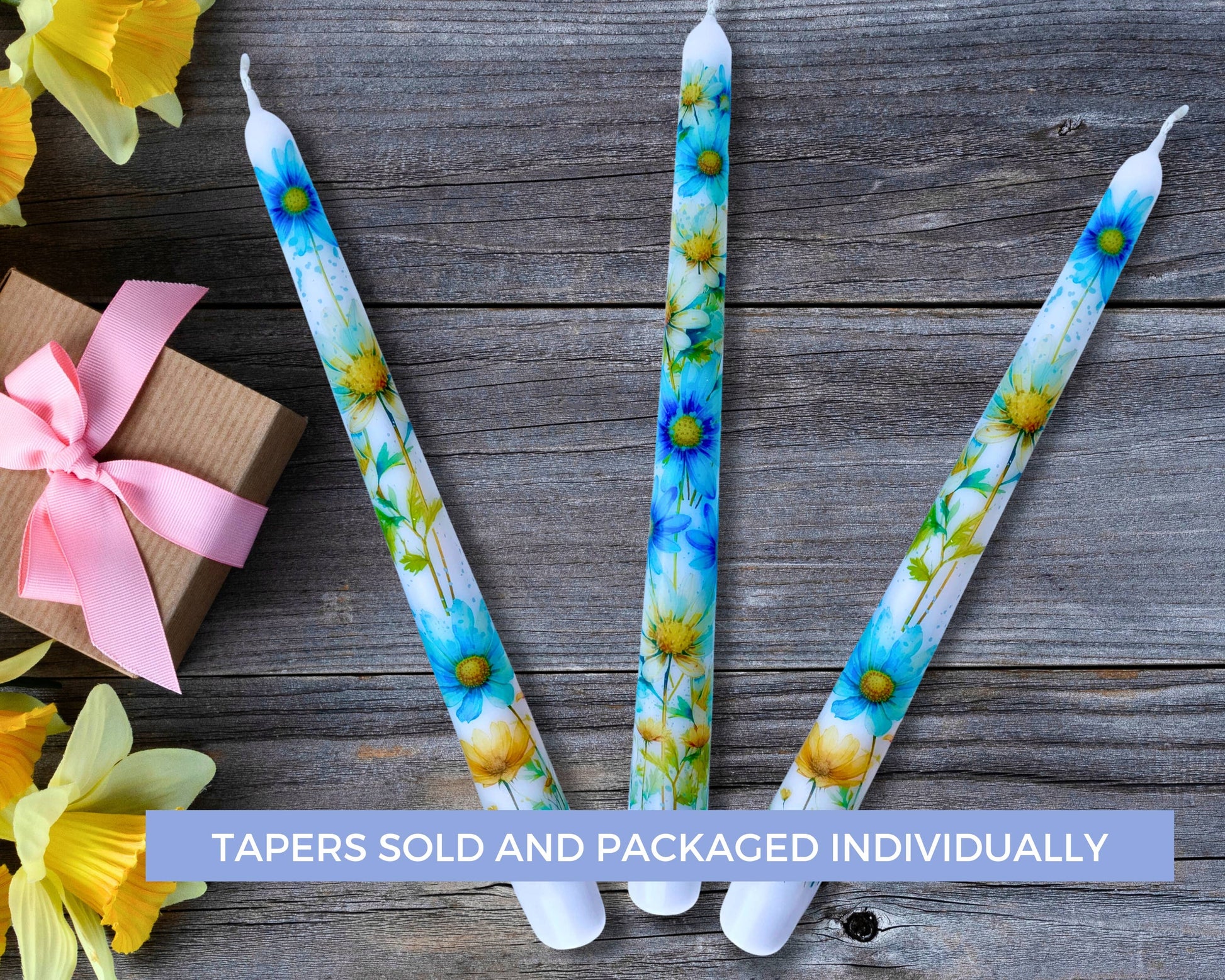 Introducing our exquisite taper candles, each adorned with a stunning blue watercolor Daisy design, perfect for adding a touch of elegance to any setting. Whether you're looking to enhance your home decor or searching for a unique birthday gift, these candles are sure to impress. Imagine them as a captivating centerpiece for a reception or wedding, creating a romantic and enchanting ambiance for your special day.