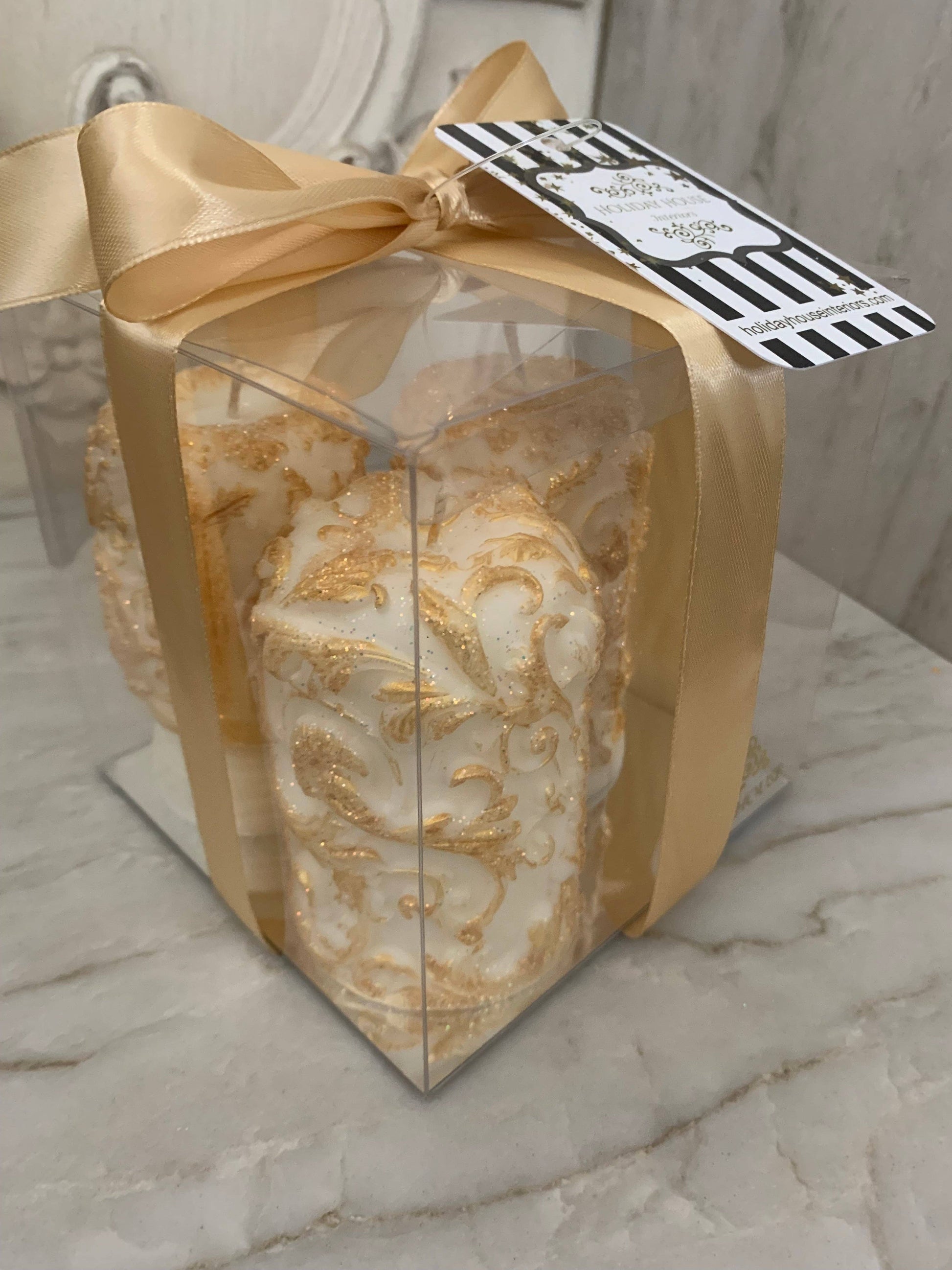 Illuminate your space with luxury and elegance with our Fancy Gilded Candle Gift Set. This set of three candles features a beautiful embossed scroll design, expertly hand gilded with luxurious gold accents and a touch of glitter. Perfect for the holiday season or adding a touch of glamours sophistication to any day. * 100% soy wax * cotton wick * Designed and poured in California, USA. Specifications for each of the 3 candles are, 8 oz/255 g, 2.5" x 4.5" with a 50 hours burn time, Gift Boxed with Bow. As with all candles we reccomend that you burn candle within sight. Keep away from children and pets. Remove cover and/or tag before burning. Keep wax pool free of debris. Discard when 1/2" un-melted wax remains. Trim wick to 1/4" each time candle is lit. Avoid drafty areas. After 4 hours of burning, extinguish flame and allow wax to harden before burning again to maximize candle burn time.