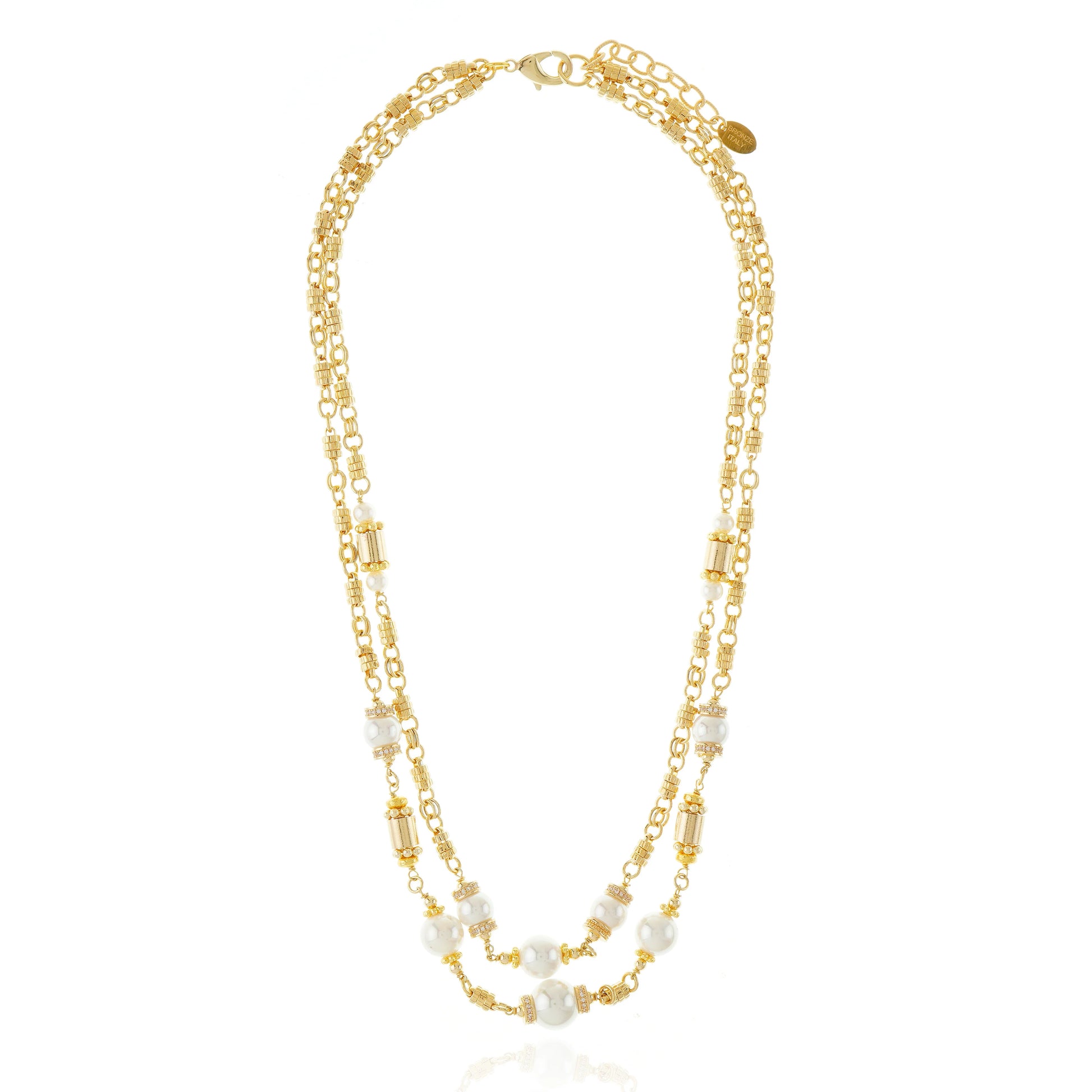 Design: Double-strand necklace with alternating pearl and textured gold elements