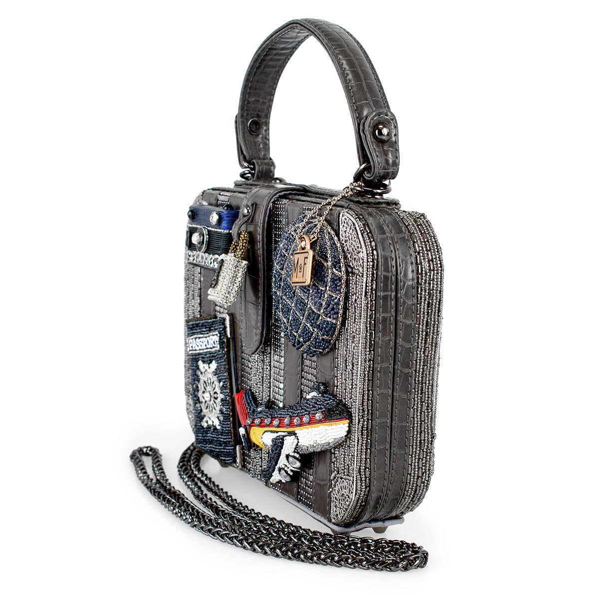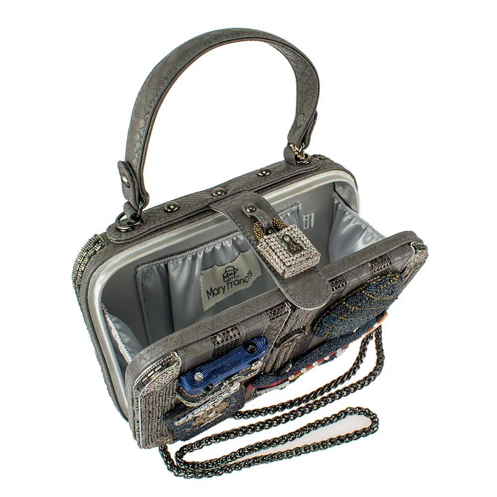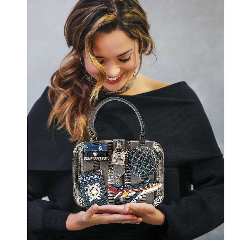 Style on the fly! Wherever your wanderlust leads you, bring along our precious top-handle, travel-themed bag featuring crystals, glass beads and delicate metal findings.