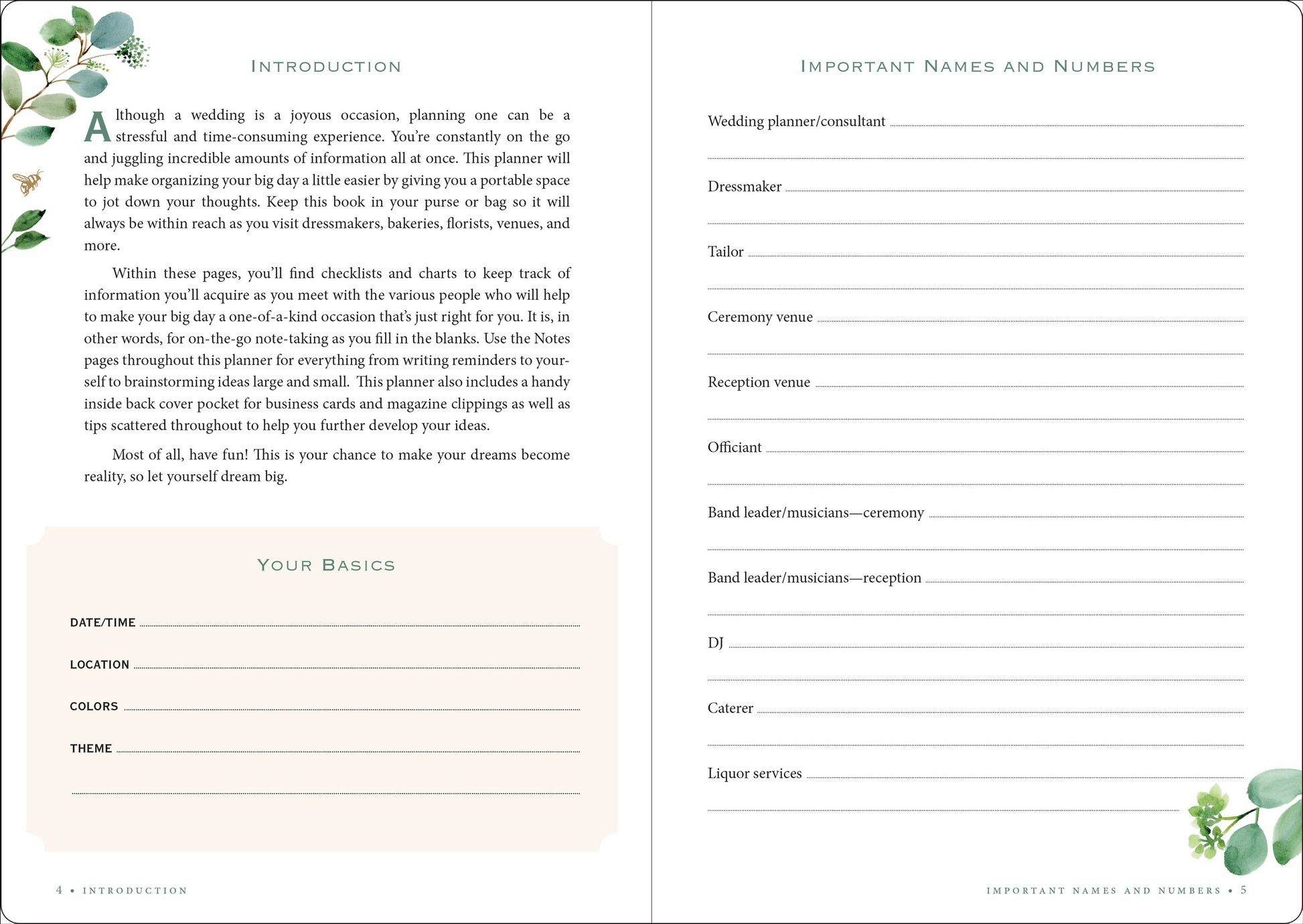 Planning a wedding can be a challenging affair. This purse-sized guided notebook will make life easier for the bride on-the-go! Concise fill-in lists and charts enable you to compile the essential information you need to stay on track as you plan pre-wedding gatherings, the big day itself, and beyond. Guided note-taking pages help organize vendor and venue information. Convenient inside back cover pocket holds notes, receipts, business cards, and more. Elastic band closure attached to the back cover keeps your place or keeps your planner secure. Sturdy board covers support writing on the go, no matter where inspiration about the big day strikes you! Pretty Eucalyptus cover design features gold foil detailing. Lightweight, take-with-you organizer measures 5-3/4'' wide x 8-1/4''. 80 pages. Matches Peter Pauper Press's other Eucalyptus gifts and stationery.