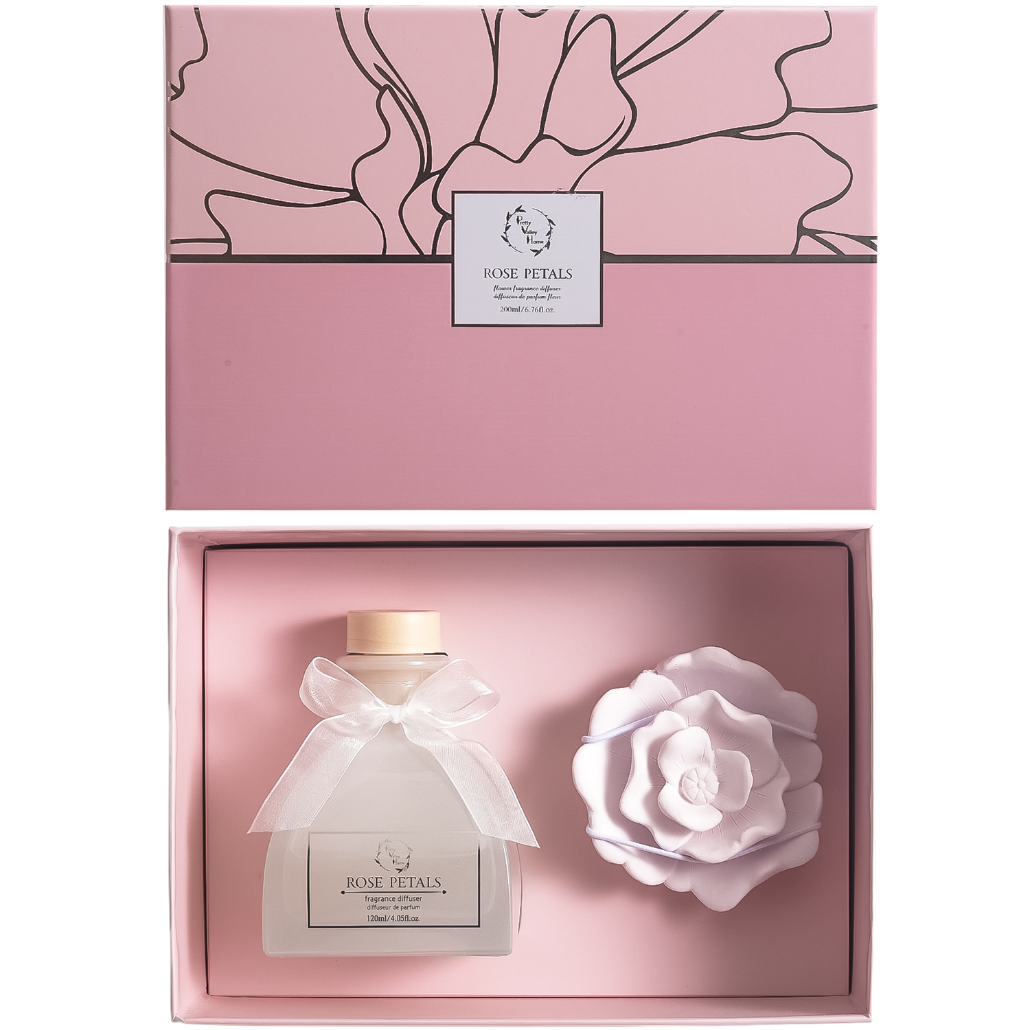 The pink ceramic rose adds a feminine touch against the soft milky white bottle, making this diffuser as elegant to display as it is delightful to experience.