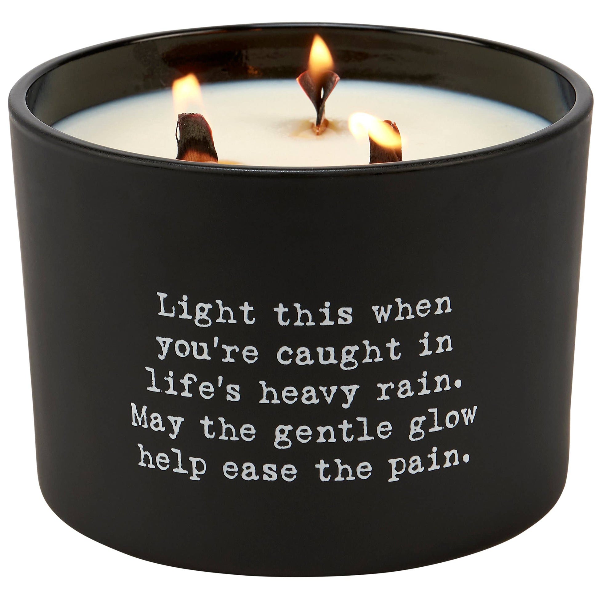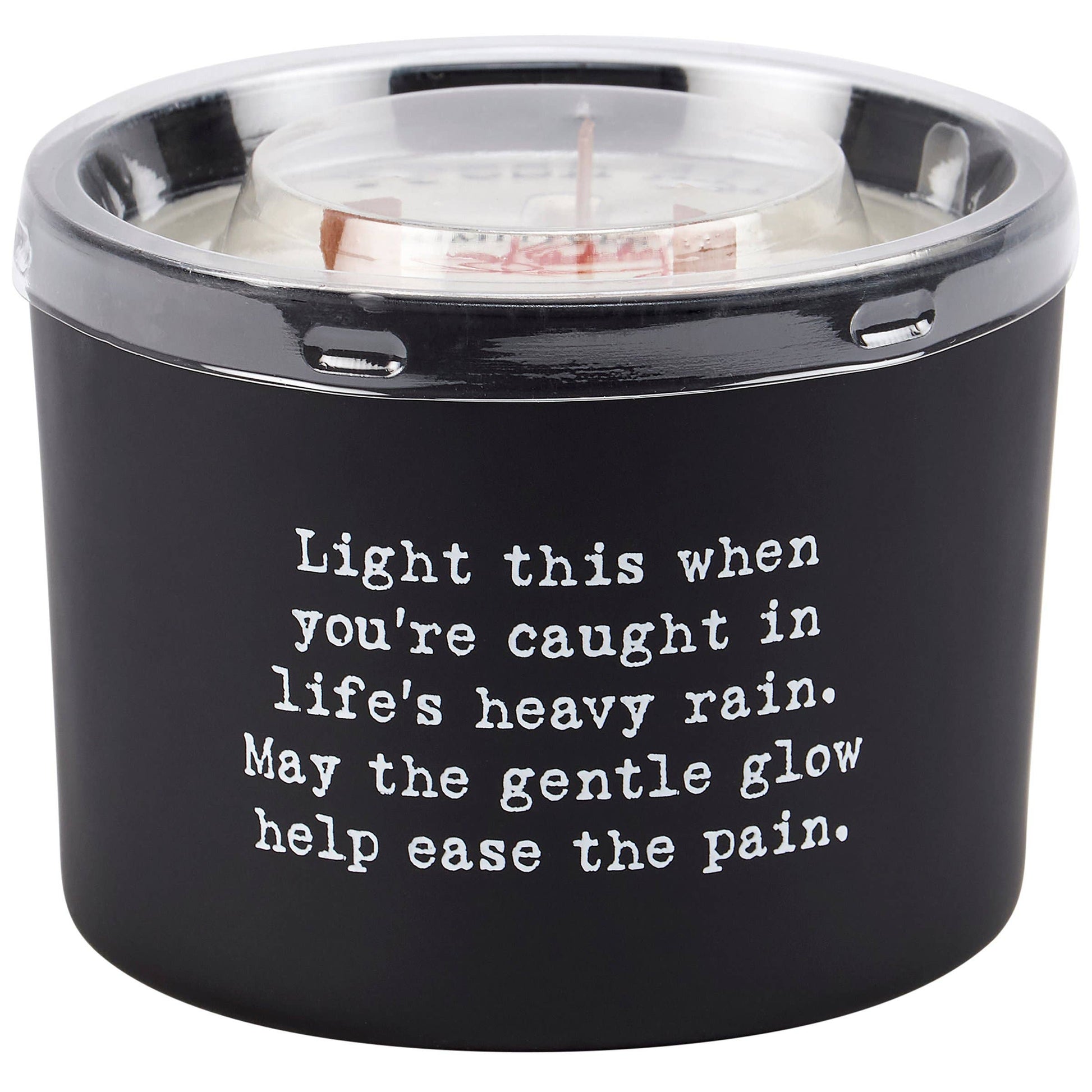 A candle from our Box Sign Style Collection displaying an inspirational poem in a typewriter style on matte black glass that reads "Light this when you're caught in life's heavy rain. May the gentle glow help ease the pain." Poetry candle features soy-based wax and 3 wooden wicks with 26 hours of burn time activating a calming Fresh Air scent. Our Ease The Pain poetry candle includes a dust cover and plastic lid for protection and enhanced appearance on store displays. An inspirational gift perfect for an everyday home accent.