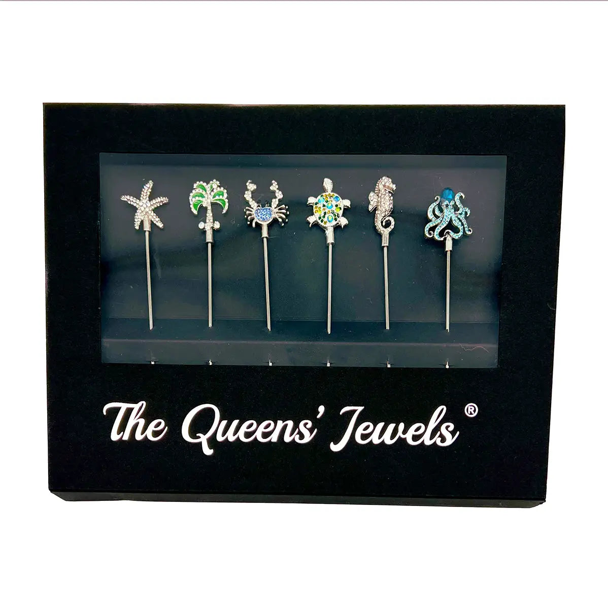 This set of 6 includes one of each of the following. Turtle, Octopus, Starfish, Blue Crab, Green Diamond Palm Tree and Seahorse.