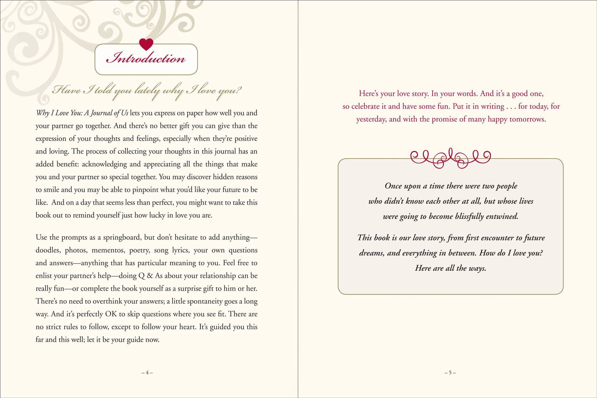 Write your love story in your own words! Designed to be filled out by one partner and given to the other, or to be explored as a couple, the prompts and questions in this guided journal offer fun and insight into your relationship. Provides plenty of space for answers and photos. Contents include: Introduction, The Facts of Life, It Had to Be You, We Go Together, Just the Two of Us, Through the Test of Time, How We Roll, Can You Imagine?, The Best Is Yet to Come. Opaque, smooth-finish pages take pen beautifully. 120 gsm paper is acid-free and of archival quality. Cover design is embossed and embellished with glossy heart-shaped highlights and gold foil accents. Durable hardcover binding. Keepsake journal measures 6-1/4'' wide x 8-1/4'' high. 96 pages.